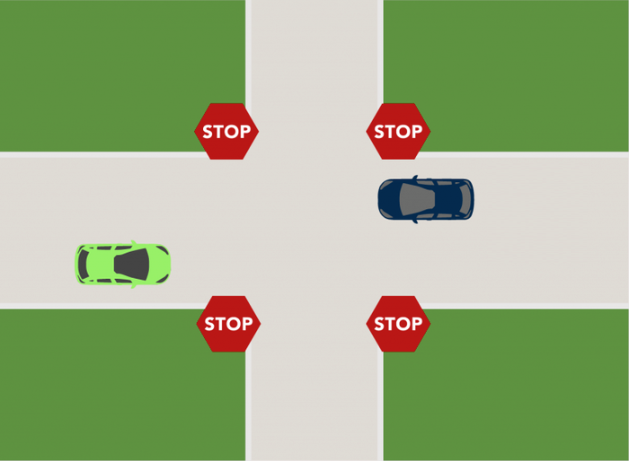 Это когда на перекрестке стоит четыре стоп знака по одному с каждой стороны. Правило такое — кто первый из четырех водителей остановился у стоп знака, тот первый и продолжает движение. По началу кажется не очень удобно, т. к. при подъезде к каждому перекрестку надо всегда окидывать взглядом еще три машины чтобы понять какой по очереди я. Но спустя какое-то время так к этому привыкаешь, что все делаешь на автомате. И чем дальше, тем больше. Со временем даже на перекрестках где нету четырех стоп знаков начинаешь тормозить по привычке. Так вот, говоря о примере тупости, многие настолько привыкли к этому правилу, что ведут себя так абсолютно на любых перекрестках не важно какого рода перекресток и есть ли на нем стоп знаки. Получается аварийная ситуация. Например я еду первый потому, что уверен я — помеха справа для другого водителя, а он едет первый потому, что он на 1 секунду раньше меня подьехал к этому перекрестку. Мы выезжаем одновременно и начинаем тупить.