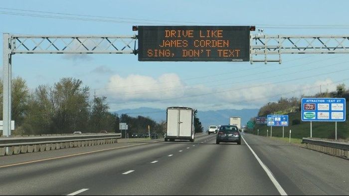 Надпись: "Водите как Джеймс Корден - пойте, а не СМСте"